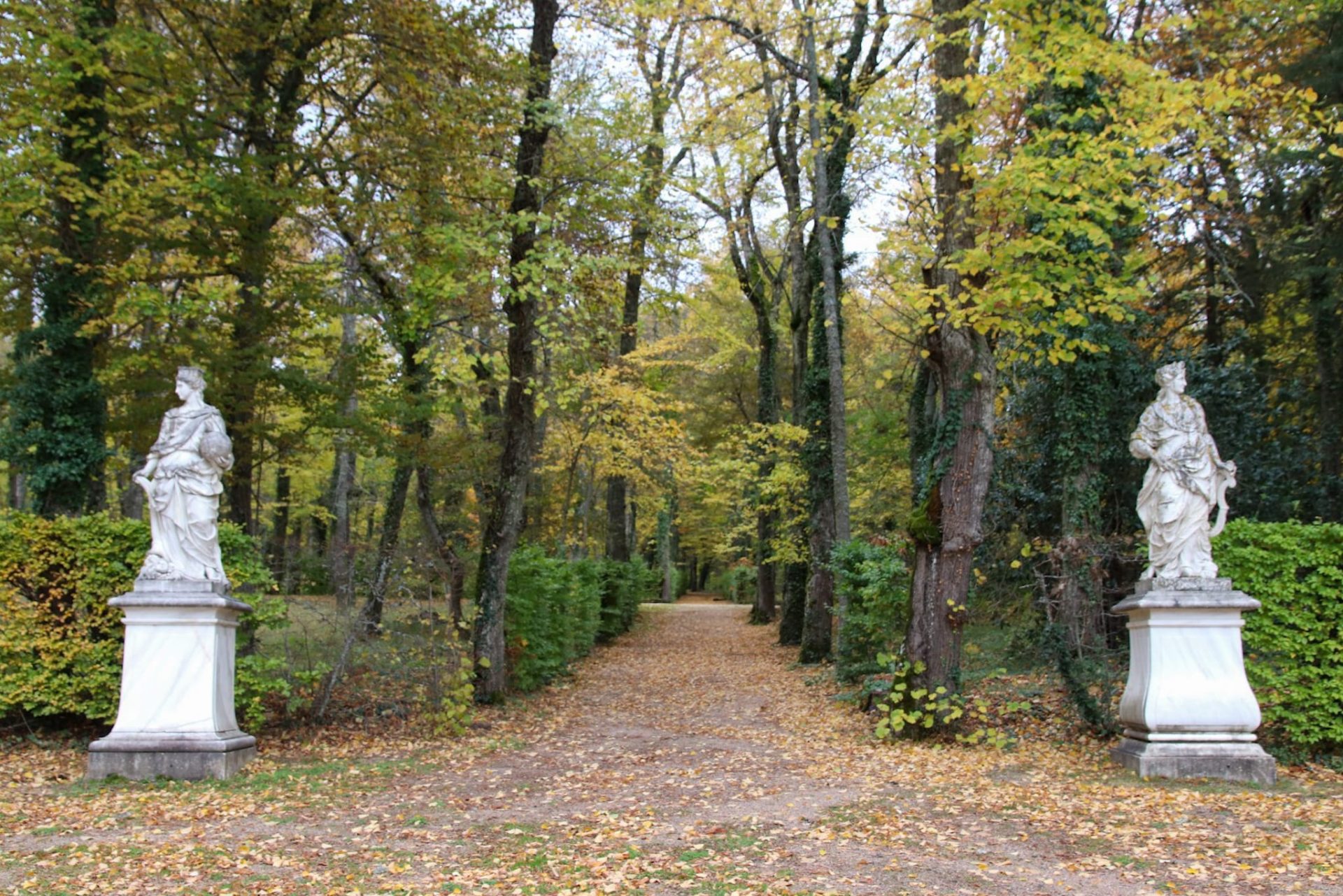 Como decía, nosotros echamos toda la mañana deambulando de aquí para allá por pasillos repletos de hojas y admirando sus espectaculares fuentes, que aunque apagadas las esculturas son realmente sorprendentes. Disfrutamos mucho de la visita a este bonito lugar y como no, echamos algunas bonitas fotos.