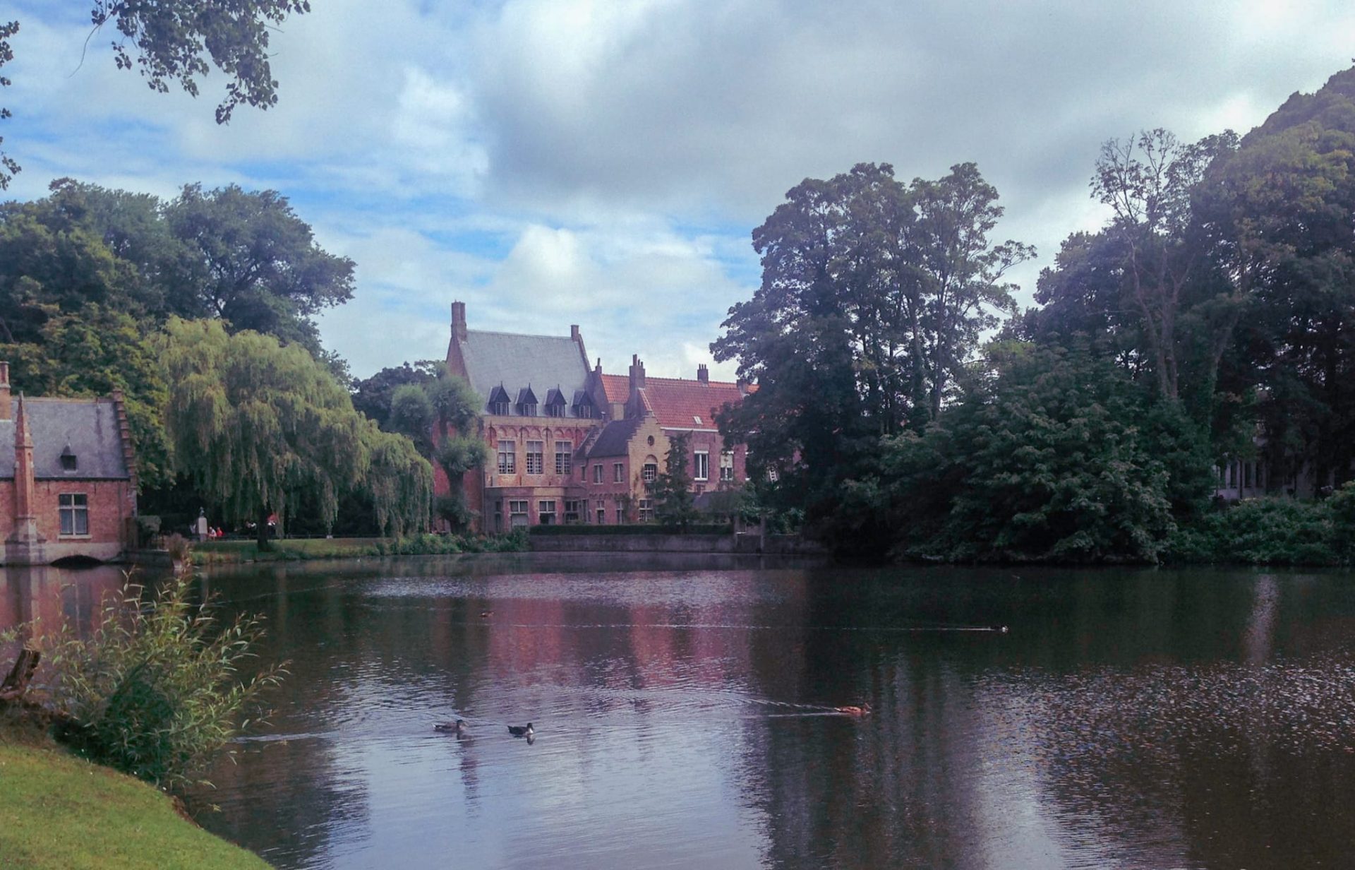 comenzamos a adentrarnos en el medieval casco histórico de Brujas por el bonito Minnewater, El parque del Lago del amor, parque al sur del casco histórico donde se relajan los lugareños y se dan plácidos paseos rodeados del bonito lago, íntimos jardines y cisnes, siempre hay muchos de ellos en el Lago del Amor, y aquí fue donde comenzamos a enamorarnos de esta bonita ciudad.