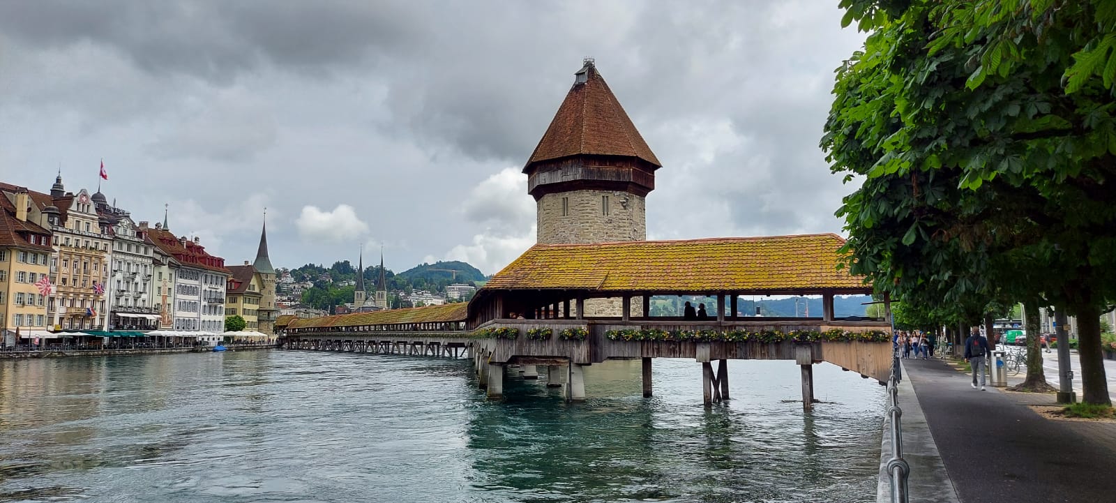 El viajecito mereció la pena, aparcamos en un parking justo debajo de la estación central, super céntrico y además ya cuando sales te deleitas con el Kapellbrücke o puente de la capilla, el puente de madera más antiguo de Europa y el segundo más largo que conecta la ciudad antigua con la nueva de Lucerna, sus pinturas en el interior narran la historia de la ciudad. Ya solo por estas vistas y pasear por el bonito puente merece la pena llegar hasta aquí.