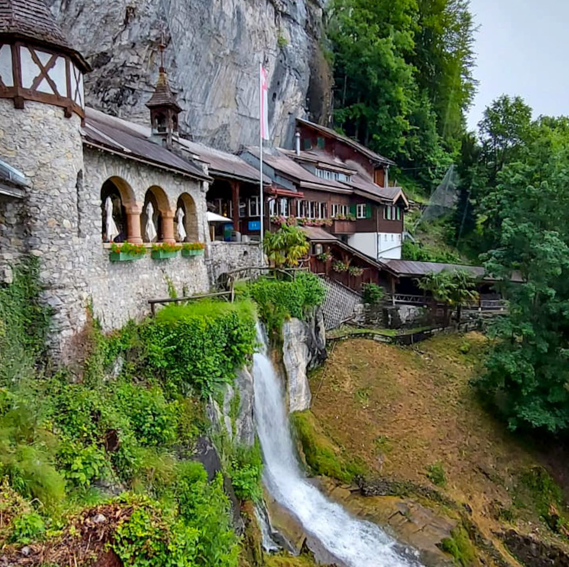 Al final del día nos llovió y nos pusimos como sopas, pero la visita a las Cuevas de San Beato no nos la podíamos perder, son uno de los lugares más bonitos que hayamos visto nunca. Aunque no pudimos visitar el interior porque ya había terminado el horario de visitas todo el exterior es maravilloso, con unas cascadas que surgen de la roca bajo las construcciones que albergan la entrada a la cueva y un paseo por el bosque hasta llegar a ese lugar que realmente vale la pena, si tenéis opción no dudéis en visitarlo, aunque en temporada alta tendréis que ir temprano pues se ha convertido en una de las vistas más famosas de esta zona de Suiza. A nosotros el interior nos queda pendiente para un próximo viaje.