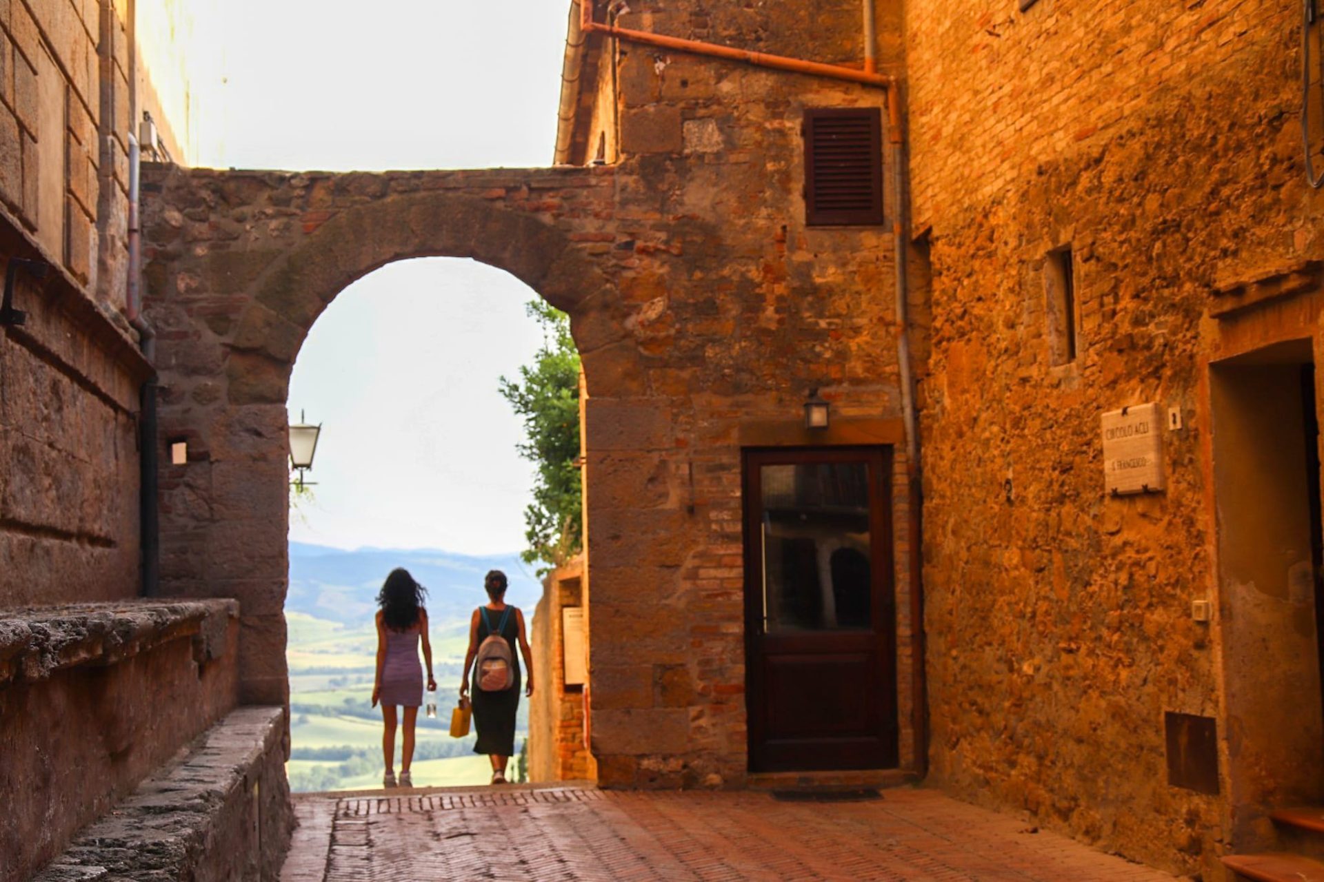 Este pueblo se encuentra en el corazón del Valle del Orcia, rodeado de un paisaje de viñedos y olivos en las colinas ondulantes. Todo el centro es un monumento que además está lleno de bares, restaurantes y tiendas de productos regionales. Después de comer y dar un paseo descubriendo este pequeño y bonito pueblo recuerdo sentarnos a media tarde para tomarnos un vino con una tabla de quesos y ricos productos típicos de la zona en la Cantina Osenna y descubrir una preciosa terraza que te enamorará con unas increíbles vistas de la campiña y Pienza al fondo. El vino nos gustó tanto que terminamos comprando unas botellas en su pequeña y encantadora bodega.